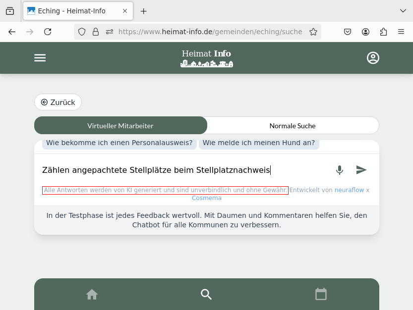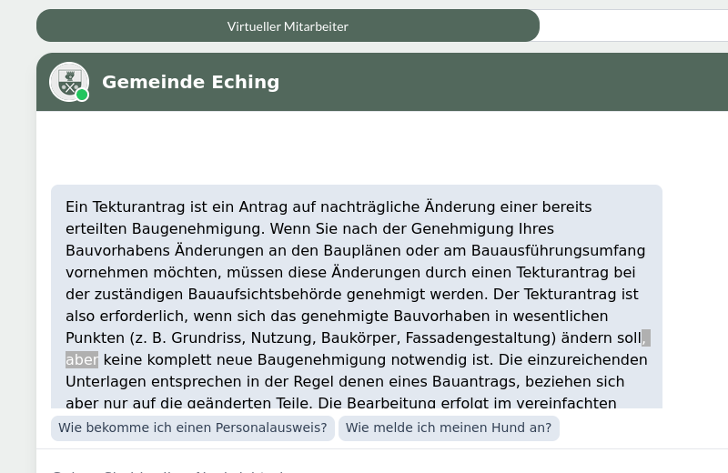 Bei der Vorstellung der von der Gemeinde bestellten KI-Auskunft wurde erklärt , diese liefere "rechtssichere" Auskünfte. Bei der Auswahl von Angeboten für die Bürgerbeteiligungssoftware waren Anbieter ausgeschlossen worden, die zu Ihrem Produkt erklärten, es werde im Betrieb und in Kooperation mit dem Besteller, also der Gemeinde, weiterentwickelt. Unter dem Feld zur Eingabe des Fragetextes für die KI-Auskunft wird nun allerdings darauf hingewiesen, dass die Beantwortung unverbindlich und ohne Gewähr erfolge [7].