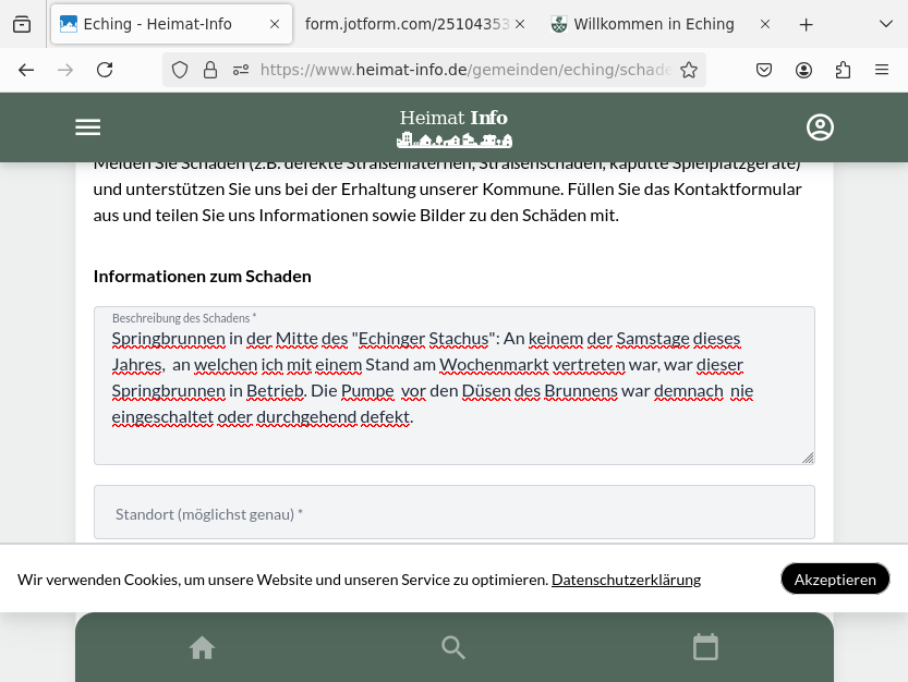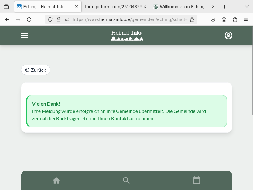 Beim Schadensmelder in der Eching-App bzw. der Site www.heimat-info.de [9] handelt es sich offenbar nur um ein Kontaktformular, das eine E-Mail erzeugt.