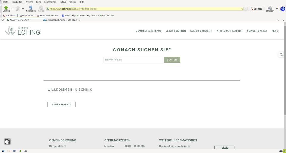 In der Gemeinderatssitzung vom 28.10.2025 merkte Herr Read stellvertretend für die Abteilung Öffentlichkeitsarbeit an, dass es auf der Gemeindehomepage in der Presseerklärung zur Eching-App einen Hinweis auf die Heimat-Info-Seite gebe. Allerdings lieferte am Sitzungsabend die Suchfunktion der Homepage keine Treffer zu diesem Wort; siehe Screenshot.